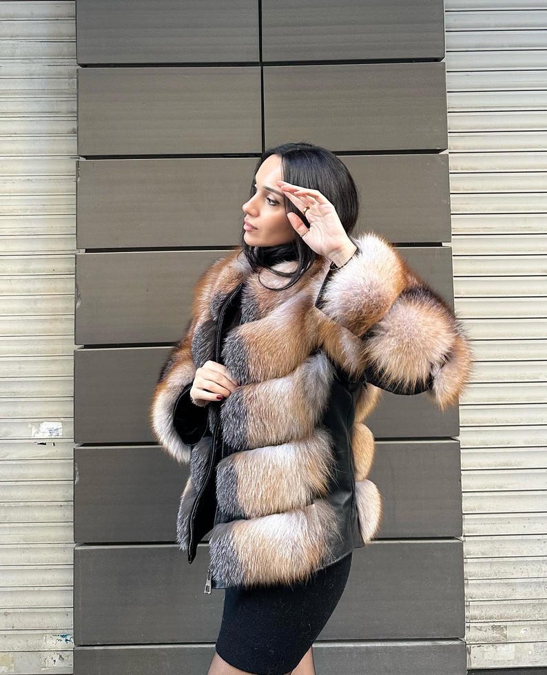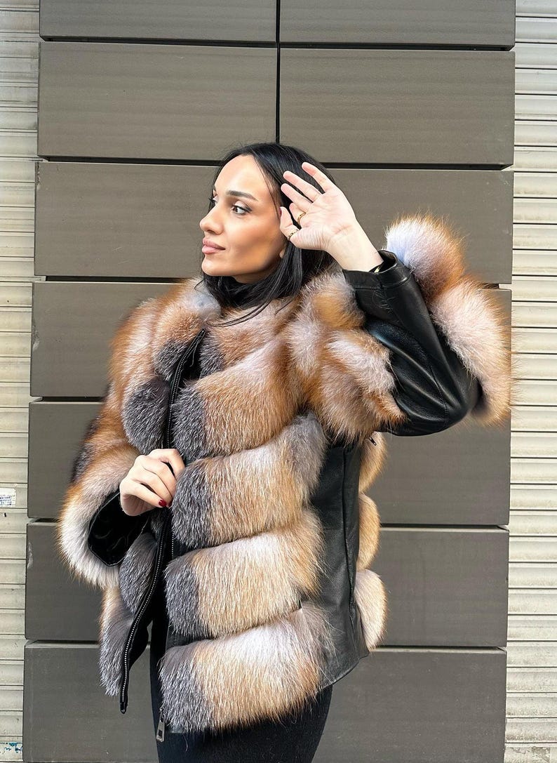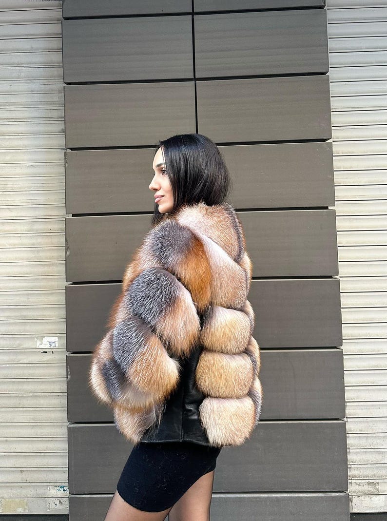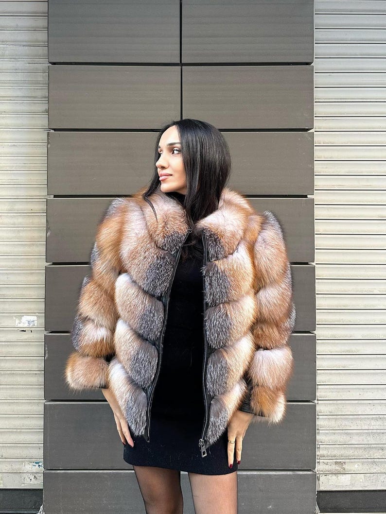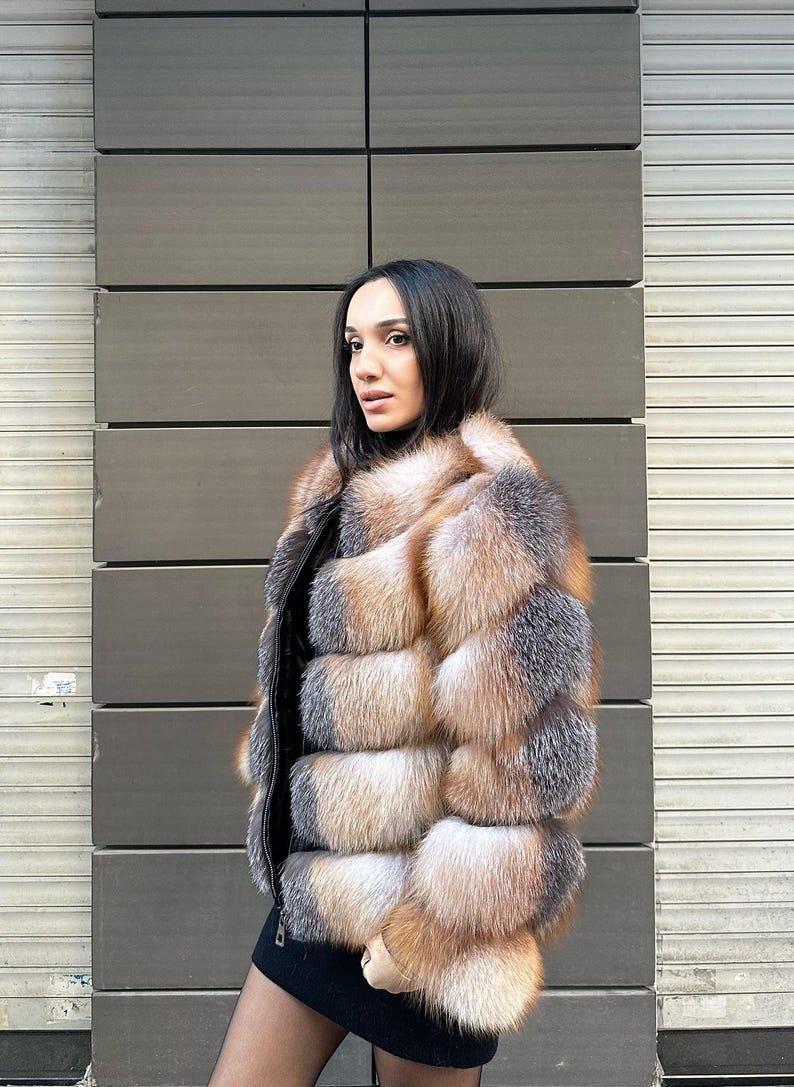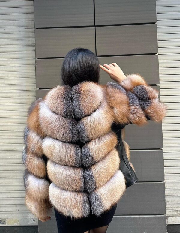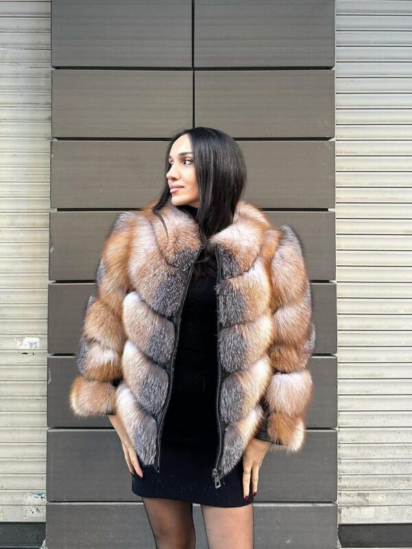 This coat is made of natural frost fox fur, showcasing its signature blend of silvery-gray, brown, and warm beige tones. The fur is arranged in thick horizontal panels, giving the piece a plush, voluminous texture. Its cropped, structured silhouette combines luxury with a modern, fashionable edge.
