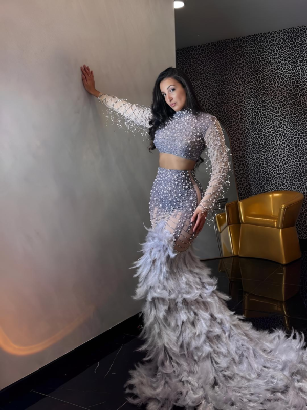 The Adellina dress is a stunning two-piece gown featuring a sparkling, bead-embellished long-sleeve crop top paired with a high-waisted fitted skirt that beautifully contours the body. Intricate crystal detailing and sheer illusion panels add a glamorous, red-carpet feel, while the dramatic feathered mermaid train creates a show-stopping finish. Available in many colors, this statement design is perfect for proms, galas, and upscale evening events.