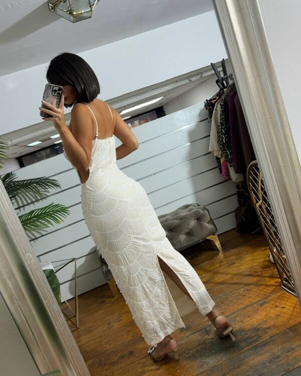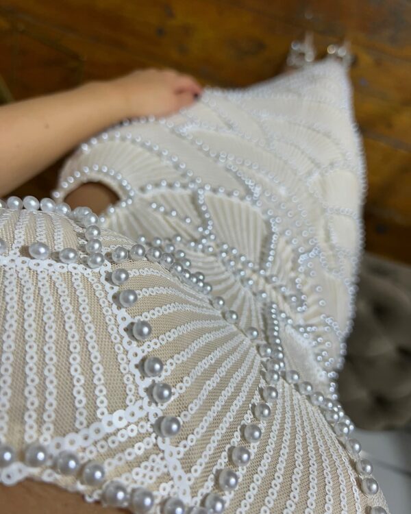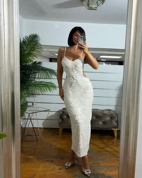The Allison dress is a stunning figure-hugging design adorned with intricate pearl embellishments that create a luxurious, eye-catching pattern. Featuring delicate straps and side cut-outs, it perfectly combines elegance with a touch of allure. Ideal for evening events or special occasions, this dress ensures you’ll stand out with timeless sophistication and modern glamour.