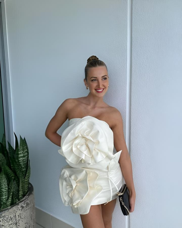 This is a strapless ivory mini dress with a structured bodice and large ruffled fabric detail on the chest. Around the belly and waist area, the dress is fitted and features a large decorative rosette-shaped fabric design that adds volume and draws attention to the midsection. The overall style looks elegant and sculptural, like a modern statement cocktail dress.