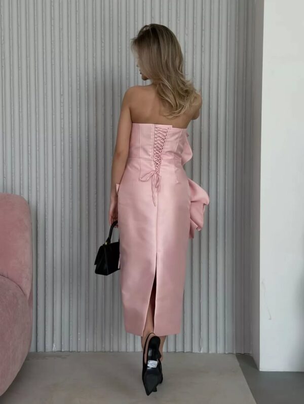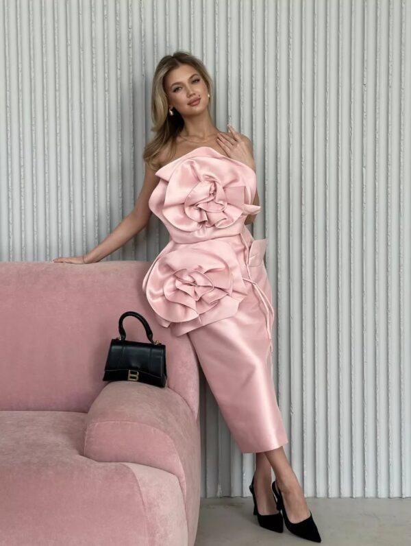 The Belly dress is an elegant strapless midi design featuring a sculpted silhouette that beautifully accentuates the figure. It is adorned with oversized floral appliqués—one across the bodice and another at the hip—creating a bold, couture-inspired statement. Crafted from smooth, structured fabric, this piece delivers a refined and modern look perfect for special occasions or evening events.