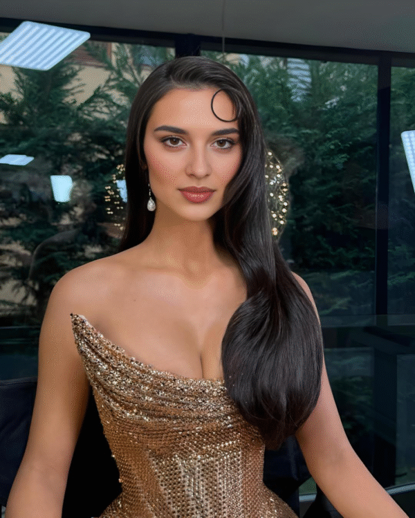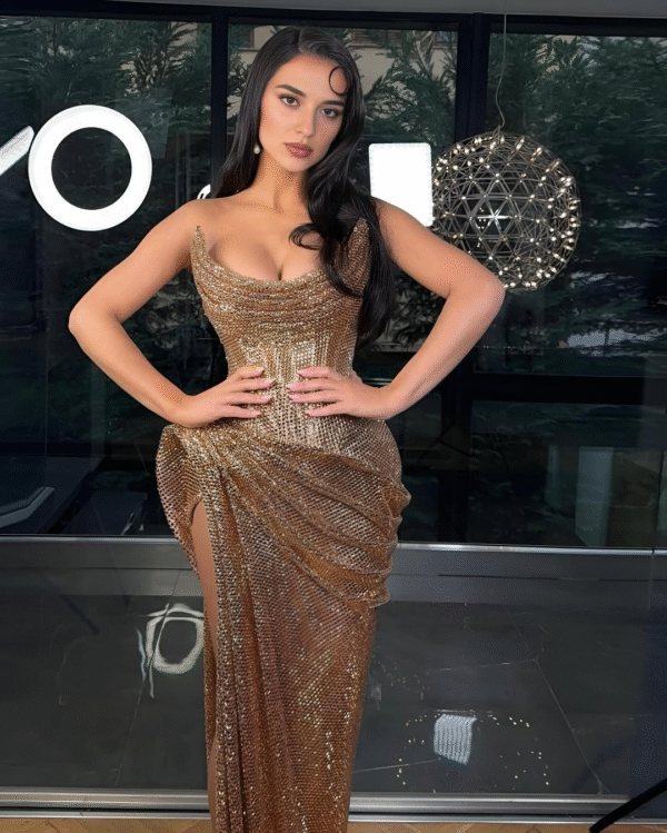 The dress Charlotte is wearing is a dazzling gold gown adorned with shimmering embellishments that catch the light beautifully. It features a draped neckline, a structured corset-style bodice, and a dramatic high slit that adds allure and sophistication. The overall design is glamorous and figure-hugging, perfect for a red-carpet or evening event.