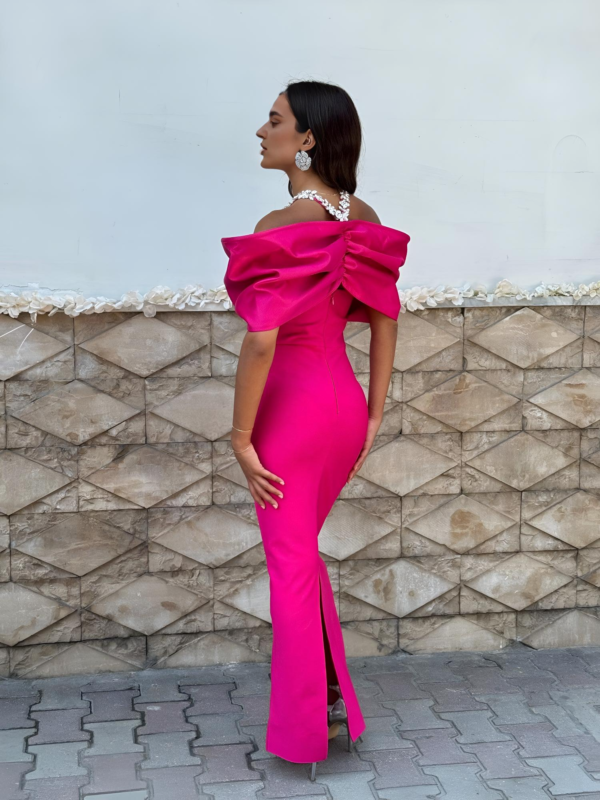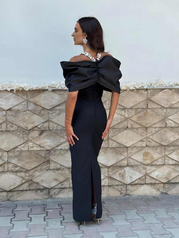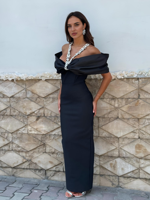 The Emma dress features an elegant off-shoulder silhouette with a beautifully draped neckline, highlighted by a statement crystal-embellished detail that adds a touch of luxury. Designed to flatter the figure, it offers a sleek, elongated shape perfect for formal events and special occasions. This model is available in five different colors, making it easy to choose the perfect style for any moment.