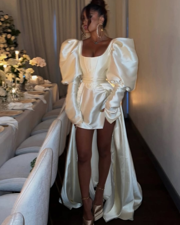 Eveline is a statement satin mini dress featuring a structured corset bodice and a flattering square neckline that beautifully highlights the silhouette. The dramatic puff sleeves and matching long gloves add a bold, couture-inspired touch, while the detachable floor-length train creates an elegant contrast. This design blends modern glamour with timeless sophistication, perfect for special occasions where you want to stand out.