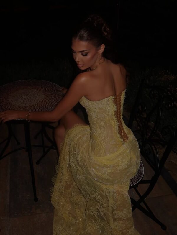 The Georgina dress is a stunning, figure-hugging evening gown crafted from delicate, sheer lace adorned with intricate embroidery. It features a bold high slit that adds drama and movement, while the corset-style top enhances the silhouette with a glamorous, sculpted fit. Elegant, feminine, and unforgettable, this dress is made for making a grand entrance.