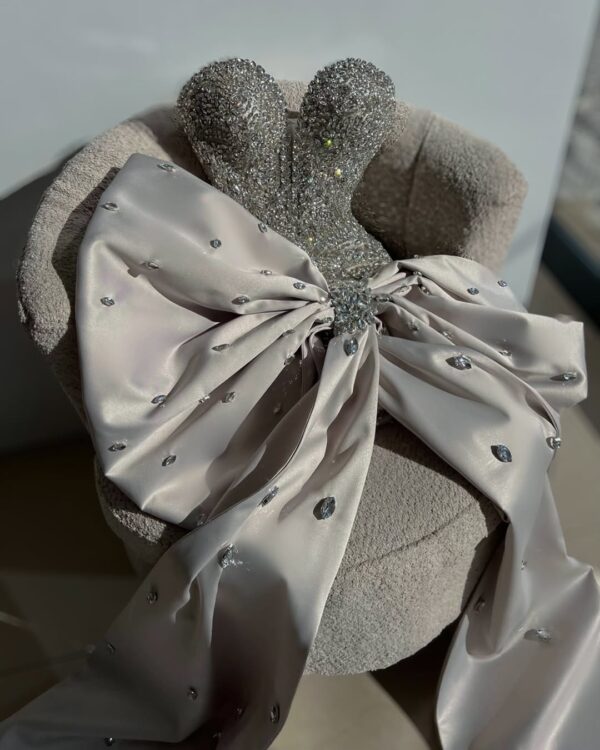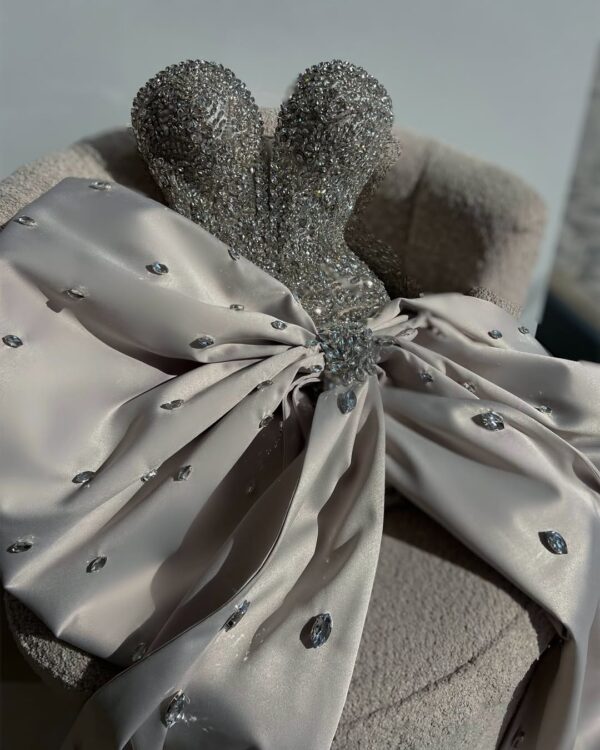 The Marianna dress is a breathtaking statement gown featuring a structured, strapless corset fully embellished with intricate crystal detailing that beautifully defines the silhouette. A dramatic oversized bow at the waist flows into an elegant, sculpted skirt with a soft train, adorned with delicate hand-applied accents for added dimension. This design perfectly balances couture glamour and modern sophistication, making it ideal for grand entrances and unforgettable occasions.
