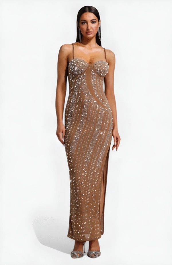 The Melanie dress is a glamorous nude-toned maxi dress adorned with shimmering crystal embellishments arranged in elegant, flowing patterns. It features thin spaghetti straps, a structured bustier-style top, and a high side slit that adds allure to the sleek silhouette. With its sparkling details and figure-hugging design, it’s perfect for high-end evening events or red-carpet moments.