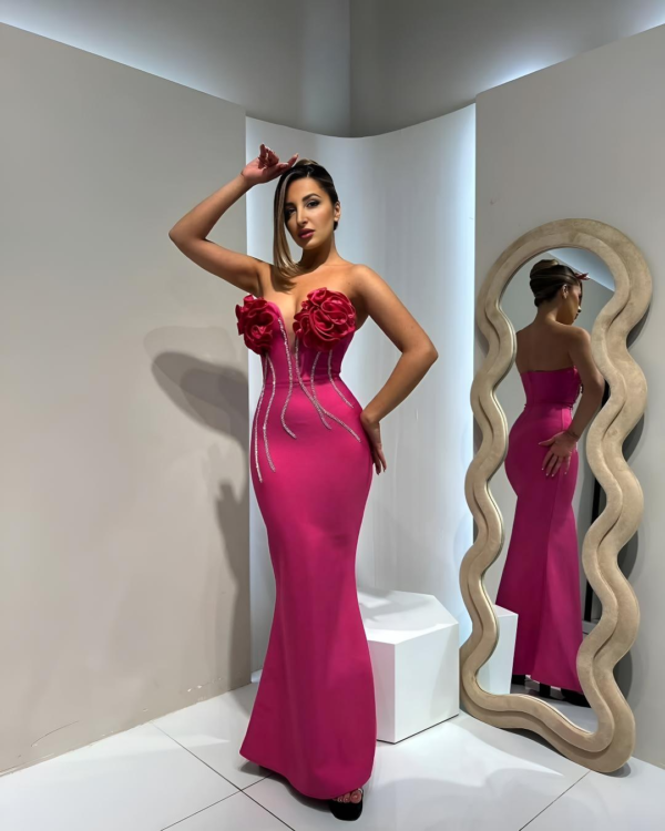 The Melorry dress is a stunning strapless mermaid gown in a vibrant hot-pink shade that beautifully hugs the body before flaring at the hem. It features striking 3D rose appliqués on the bust along with sparkling vertical embellishments that highlight the waist and add a touch of glamour. The Melorry design creates a bold, elegant evening look that feels both romantic and sophisticated.