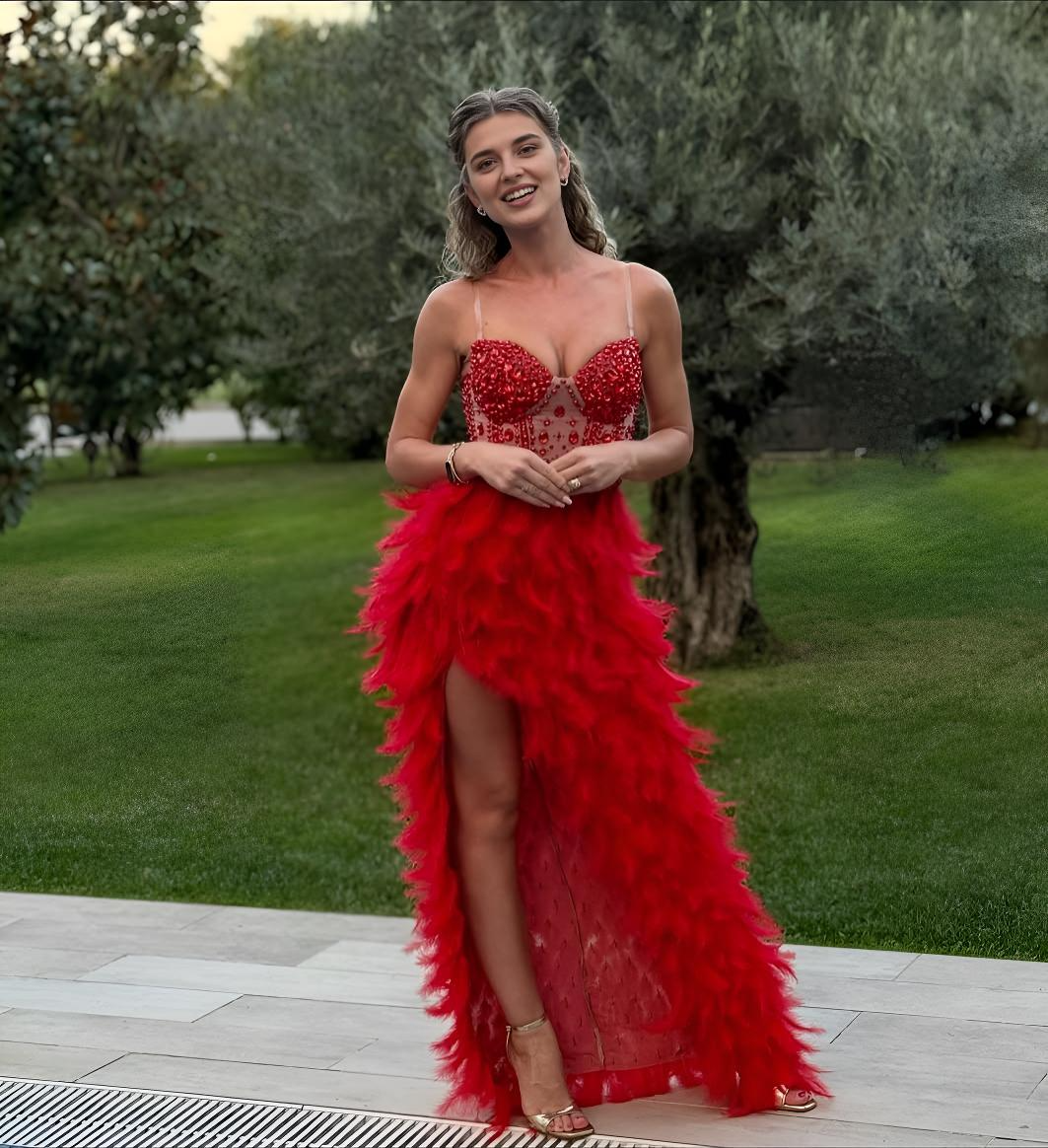 The Naomi dress is a glamorous, figure-hugging gown covered in sparkling rhinestones. It features a bold bandeau-style top with an elegant cutout at the waist, accentuating the silhouette, and a thigh-high slit that adds a touch of allure. The shimmering fabric catches the light beautifully, making it a perfect choice for evening events or special occasions.