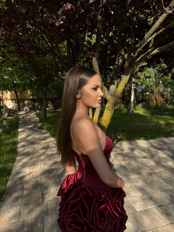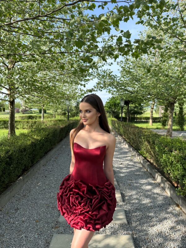 The Nicole dress is a deep burgundy strapless mini gown with a sleek, sculpted bodice that highlights the figure. Its dramatic skirt is made of luxurious, densely layered ruffles that create a voluminous, couture-style silhouette. Elegant and bold, Nicole stands out as a statement piece designed for unforgettable moments.