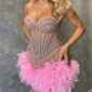 This dress has a striking, figure-hugging silhouette that beautifully emphasizes the waist and elongates the body. Its fabric is covered in a grid of reflective, shimmering details that create a luxurious, evening-ready effect. The strapless cut adds a polished, elegant touch perfect for formal events.