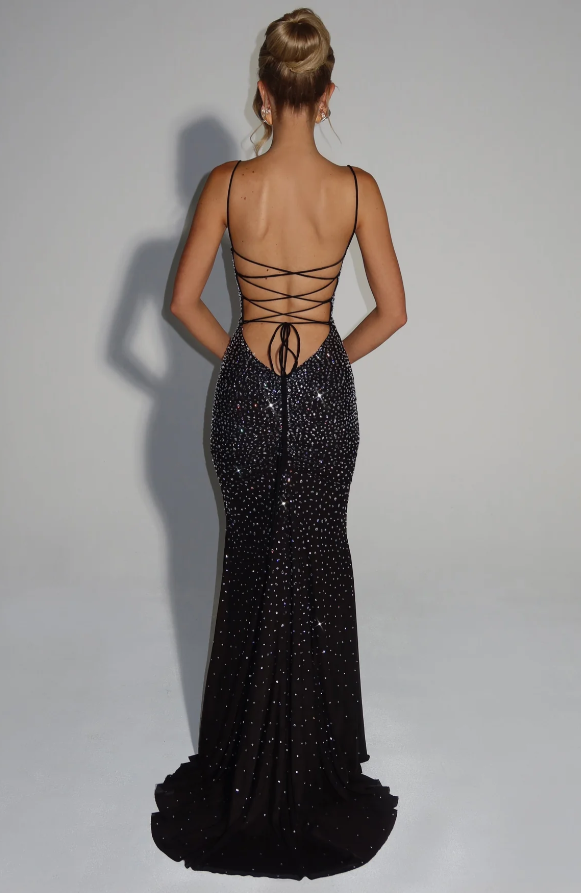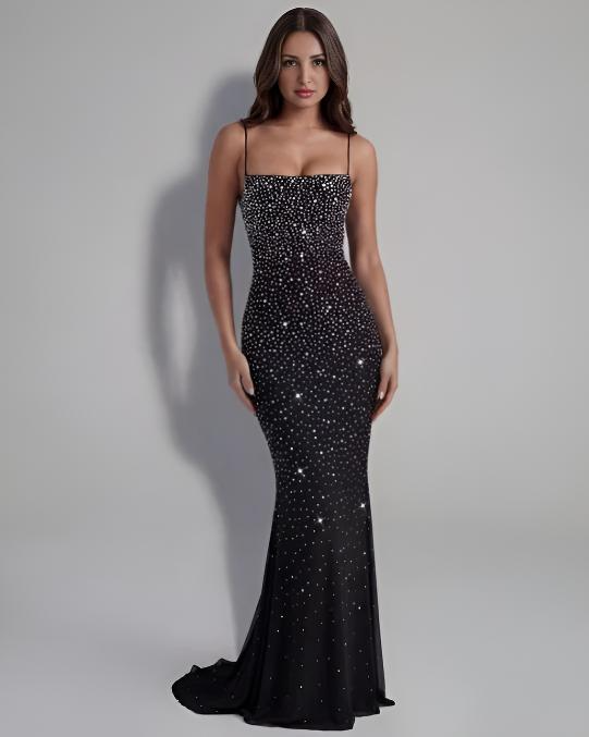The Vittoria dress is a sleek, floor-length gown with a fitted silhouette that elegantly contours the body. It features delicate spaghetti straps and a subtle square neckline, giving it a refined and modern look. The black fabric is adorned with shimmering, scattered embellishments that catch the light, creating a glamorous, starry effect.